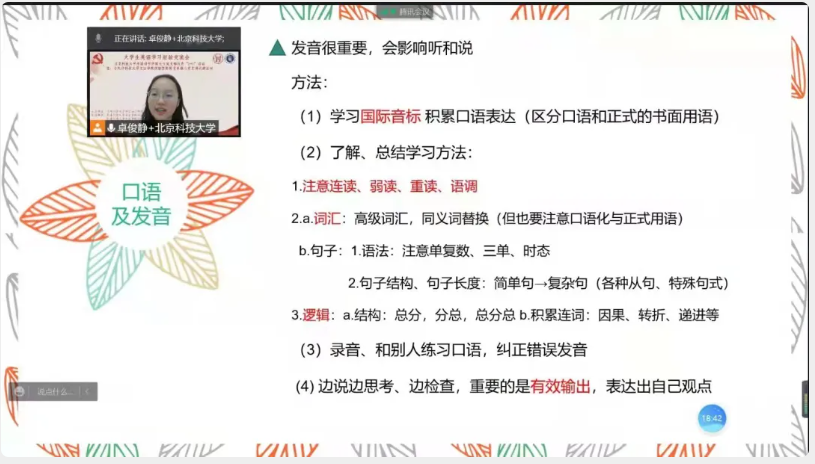 主讲人为北京科技大学外国语学院英语专业的付悦娥博士和经管学院会计学专业的徐玉洁同学。会上,两位主讲人为大家分享了考研英语和英语四六级考试的经验,为同学们提出了一些解决问题的方法,并针对同学们提出的问题给出了一些建议。