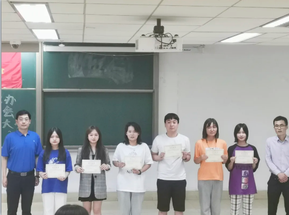大会第二项,在过去一年中,党建办各个部门涌现出许多以人为本、服务为先,坚持求真务实的优秀干事,对于他们做出的优秀成绩,由穆老师和张老师向他们颁发优秀干事奖状和实习证明,以激励党建办的新生力量。