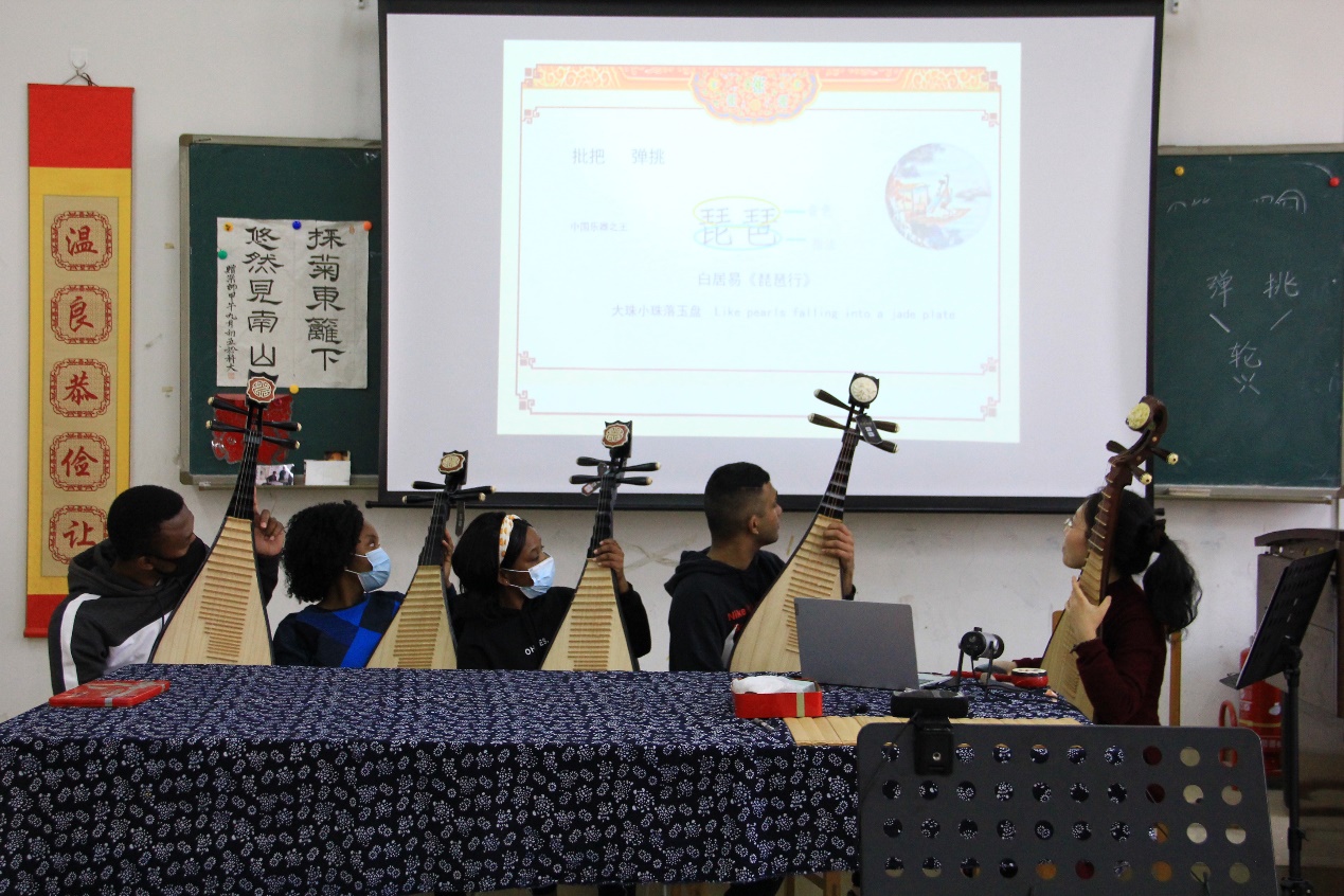 文法学院汉语国际教育系刘昀老师作为授课教师,教授几名留学生依次体验了汉服舞蹈、传统茶艺和中国民族乐器,使学生零距离接触中国传统文化,加深了对中国文化的认识和了解。在交流活动中,汉语国际教育专业的几名本科生:张嘉馨、韩周曼、刘含轩等作为助教逐一指导留学生体验中华才艺。通过一下午的学习体验,来自赤道几内亚的乔斯学会了用古筝演奏武侠名曲《沧海一声笑》,来自斯里兰卡的帝喧学会了用琵琶演奏新疆民歌《掀起你的盖头来》,来自卢旺达的李娜饶有兴趣地学习了汉服舞蹈的基本动作和茶艺茶席的基本布置,留学生们纷纷表示收获颇丰。活动结束后,几位留学生还参与了教育部中外语言交流合作中心组织的“国际中文教学技能交流活动”公开课录制,展示了我校留学生中国国情和文化教育取得的丰硕成果。