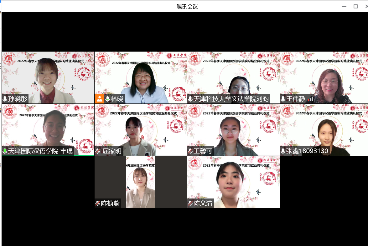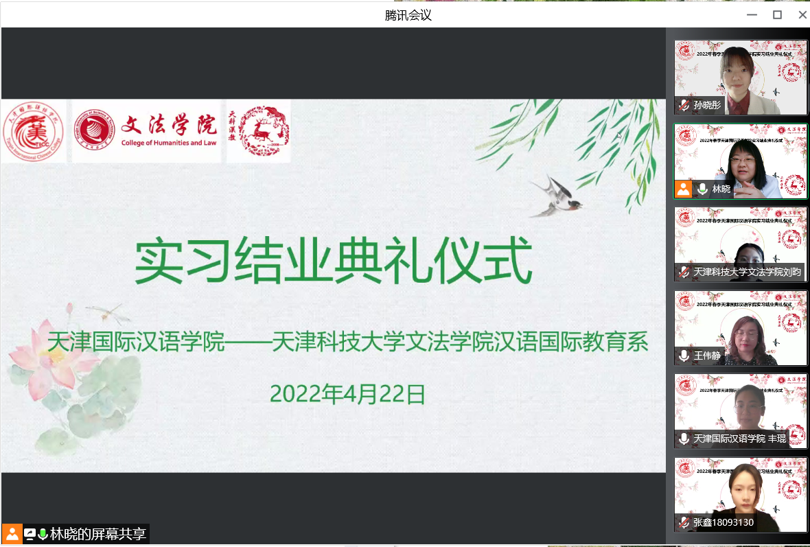 4月2日下午,文法学院汉语国际教育专业2022年度天津国际汉语学院实习项目结业仪式在线上顺利举行。我院合作实习单位负责人:天津国际汉语学院副院长丰坤、我院副院长王伟静、实习带队老师刘昀及全体实习学生共同出席,活动由汉语国际教育系主任赵林晓主持。丰琨院长代表实习单位介绍了本次实习的基本情况,展示了实习成果总结视频,并宣读了表扬信,高度赞扬我院汉语国际教育专业同学们的实习工作表现,认为同学们专业基础知识扎实,工作作风优良,及时高效地完成了实习任务,为汉语教学资源库的建设做出了贡献。